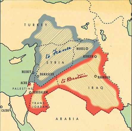 Inmitten des Ersten Weltkriegs teilen die Briten und Franzosen dasjenige Hoheitsgebiet des Osmanischen Reiches, welches heute Syrien, den Libanon, Palästina, Jordanien und den Irak umfasst, unter sich auf: Während die Grenzlinie ursprünglich zwischen Acre (Hafenstadt in Palästina) und Kirkuk (Nordirak) verlaufen sollte (Sykes-Picot-Abkommen 1916), gelingt es den Briten nach Kriegsende, auch das ölreiche Gebiet um Mosul in ihr Mandatsgebiet einzuverleiben, indem sie den Franzosen als Entschädigung die Konzessionen, die der osmanische Herrscher den Deutschen im Rahmen des Baus der Berlin-Bagdad-Bahn gewährt hatte, zusprechen.